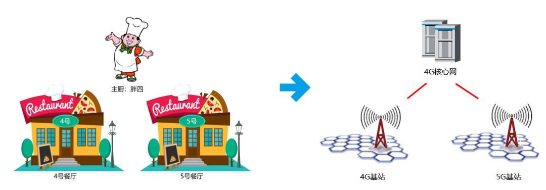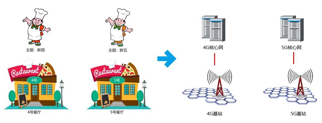 嗯,上面这个故事,聪明的通信汪肯定一下子就猜出来了——例子里面的厨师,就是核心网。店面,就是基站。4号,就是4G。5号,就是5G。
