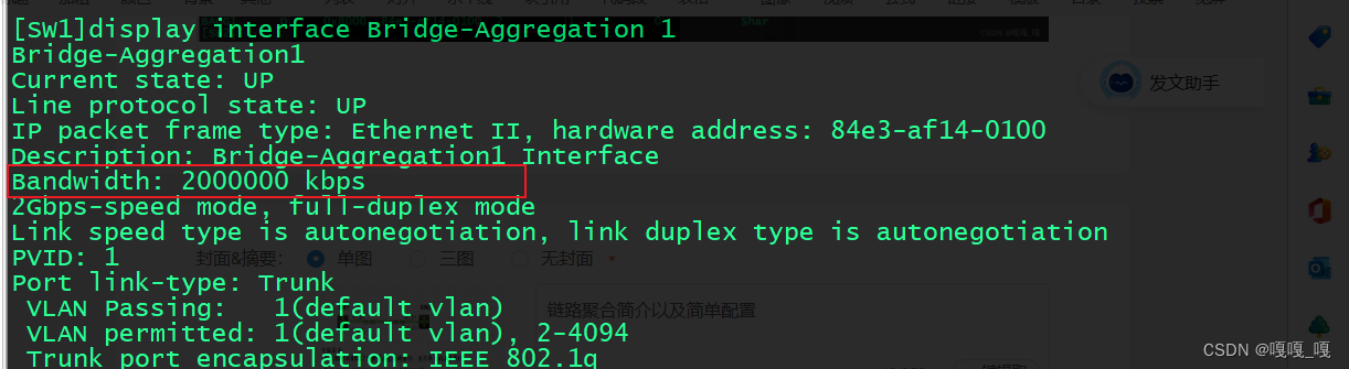 [SW1-GigabitEthernet1/0/1]port link-aggregation group 1 //将端口加入聚合组