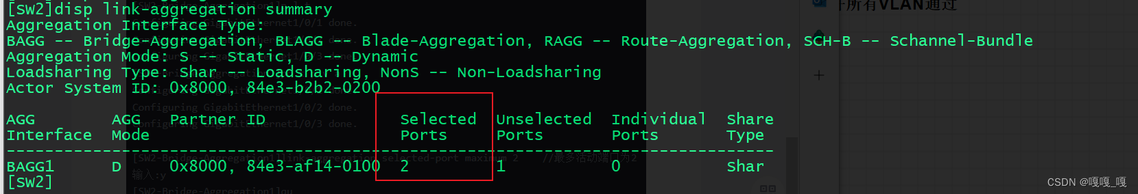 [SW2-Bridge-Aggregation1]link-aggregation selected-port maximum 2 //最多活动端口为2