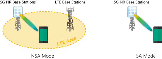 除这两个频段外,还有两种运行模式:1.结合使用 5G 和 LTE / LTE-A 以及 2 的新无线电 (NR) 技术的非独立 (NSA) 模式。使用独特的 5G NR 技术的独立 (SA) 模式,在这种模式下,使用基站和移动终端 (UE) 之间的控制来发送和接收数据。
