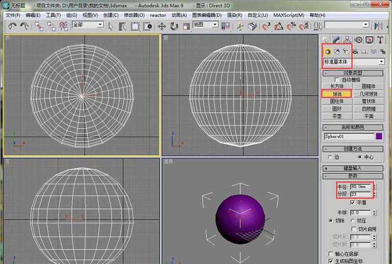 2、身体部分。在顶视图中画一个球体,半径设置为80,分段设置为23.