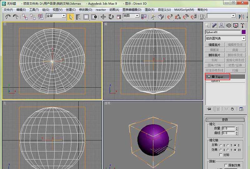 3、在修改面板里加载“锥化”修改器。锥化=taper