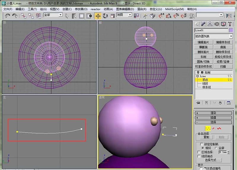 9、加载车削修改器,方向设置为X轴。然后就可以形成一个抽象的鼻子了。再将这个鼻子移到相应的位置上。