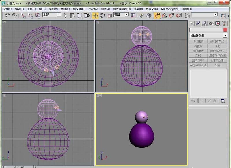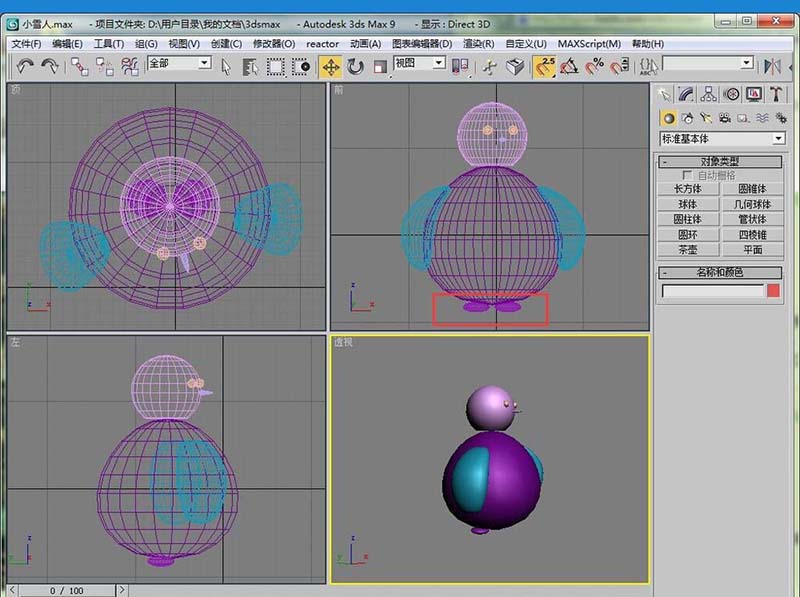 5、然后在做一个球体,这个部分当做玩具的头部。大小可以自己设置。大或者小看自己喜好了。主要是要将这个球体放在刚刚身体上面,开捕捉,结合几个视图移动。