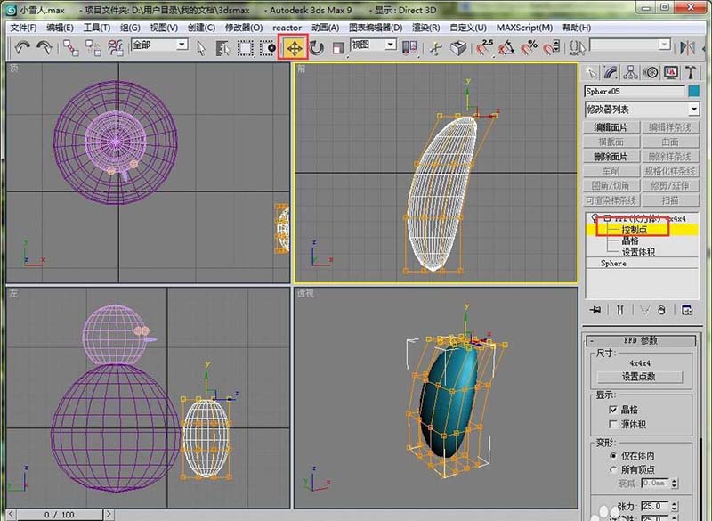 12、然后选择FFD长方体下的控制点,用移动工具将这个压扁的球体有一定的倾斜度。