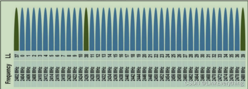 信道:40个信道(f=2402+k*2MHz,k=0, ... ,39),信道间隔2MHz,其中广播信道3个,分别是信道37、38和39,它们的中心频点分别是2402MHz、2426MHz和2480MHz。数据信道37个。