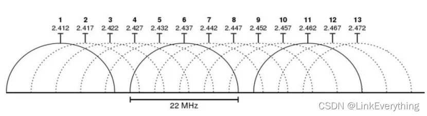 2.4GHz信道:13个信道,信道中心频点从2.412GHz到2.472GHz,中心频点之间的间隔是5MHz,每个信道的带宽是22MHz。其中,常用的三个信道1、6、11的中心频点分别为2.412GHz、2.437GHz、2.462GHz。