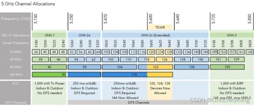 5.8G信道:5个信道(149、153、157、161、165),信道中心频点从分别为5.745GHz、5.765GHz、5.785GHz、5.805GHz和5.825GHz。