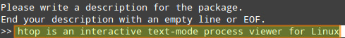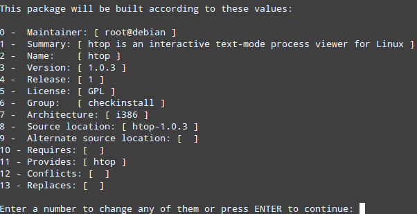 因此,要创建一个htop安装包,我们可以不带任何参数的调用checkinstall,这将使用“make install”命令创建一个包。在这个过程中, checkinstall命令会问你几个问题。