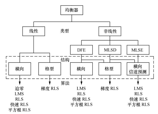 均衡技术可以分为两大类:线性均衡和非线性均衡。如果均衡器的输出未应用于均衡器的反馈逻辑中,则均衡器是线性的;反之,如果均衡器的输出被应用于反馈逻辑中并改变均衡器的后续输出,则均衡器是非线性的。线性均衡器包括线性横向均衡器、线性格型均衡器等,非线性均衡器包括判决反馈均衡器(DFE)、最大似然序列估值器(MLSE)和最大似然符号检测器(MLSD)等。均衡器的结构有很多种,并且每种结构在实现时又有很多种算法,如最小均方误差算法(LMS)、递归最小二乘法(RLS)、快速递归最小二乘法、平方根递归最小二乘法和梯度递归最小二乘法等。
