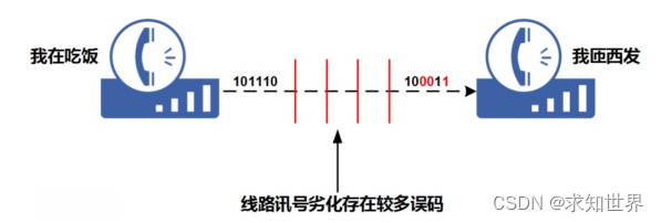 P5:我们在生活中能直接感觉到误码影响的就是电话通话,在通话线路不好时候,听筒会出现杂音还有对方的说话断断续续。这是因为,通话双方之间的线路存在较大的误码率,所以通话会有杂音和断断续续,如图所示。