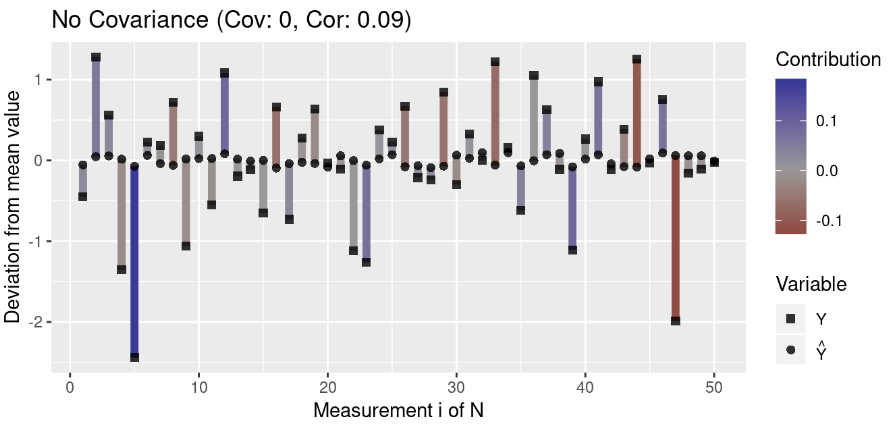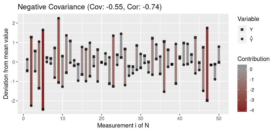 这意味着,如果预测和结果与平均值的偏差相似,则它们的协方差将为正;如果与平均值具有相对的偏差,则它们之间的协方差将为负。