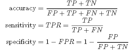 基于混淆矩阵,可以计算准确性,敏感性(真阳性率,TPR)和特异性(1-假阳性率,FPR):