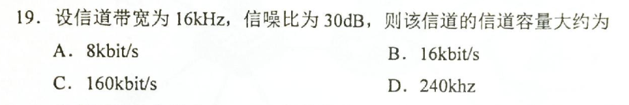 代入香农公式C=Blog2(1+S/N)=16K * log2(1001)约为160Kbit/s
