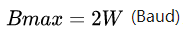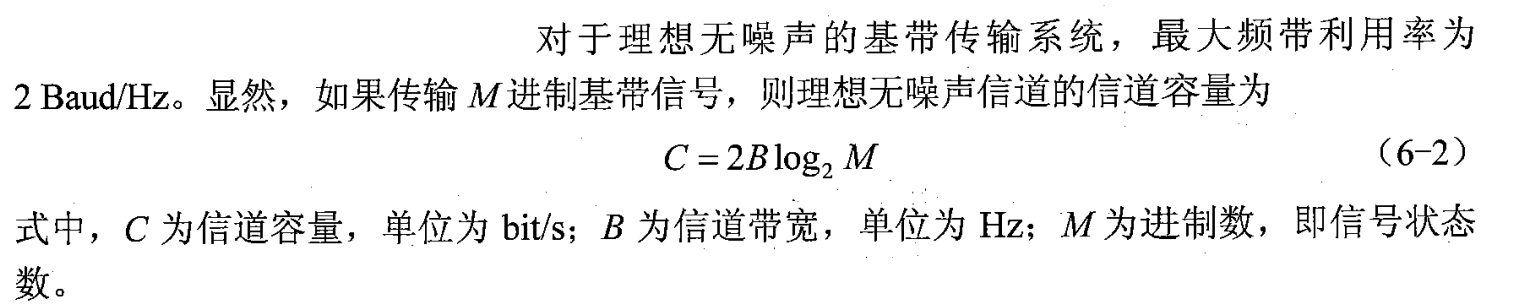 奈奎斯特准则: 对于一个带宽为W(Hz)的无噪声低通信道,最高的码元传输速率Bmax: