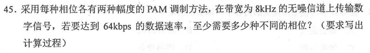 应该能想到奈式准C=2Blog2M代入 64=2*8log2M,得到M=16,也就是说一个码元带16比特数据,因为每种相位有两种幅度,也就是每种相位带了两个数据,所以需要相位数/2=8种不同相位。