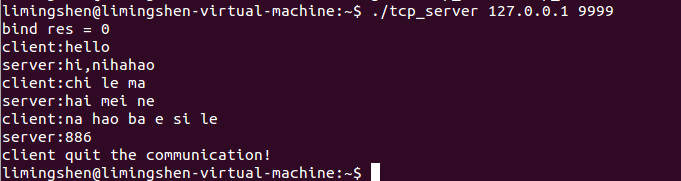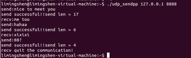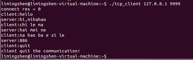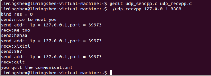 运行程序需要打开Linux中打开两个终端,分别编译运行服务端和客户端的源文件,IP地址选择本地地址,端口号建议选择8000以上比较稳定比如9999,首先客户端发送信息到服务端,服务端在接收到客户端的信息后才可以回复,双方都可以输出quit来结束本次通信