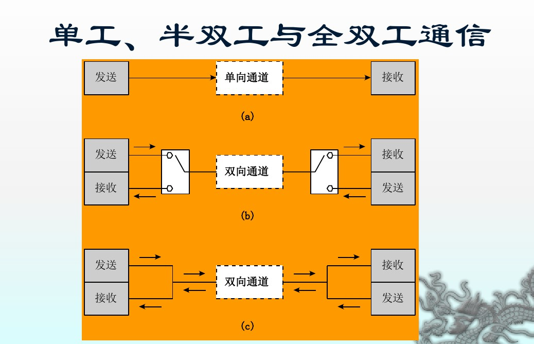 3、全双工通信,是指同时发生在两个方向上的一种数据传输方式,如图中©所示。电话机就是一种全双工设备,其通话双方可以同时进行对话。计算机之间的高速数据通信也是这种方式。