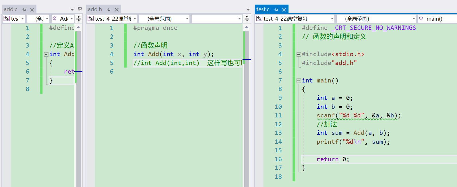 如果将Add函数的声明和定义都放置其他头文件和源文件里面,当test.c想应用Add函数是,只需在函数头包含头文件(#include"add.h")即可。