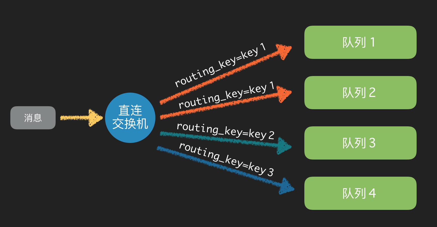 直连交换机是一种带路由功能的交换机,一个队列会和一个交换机绑定,除此之外再绑定一个routing_key,