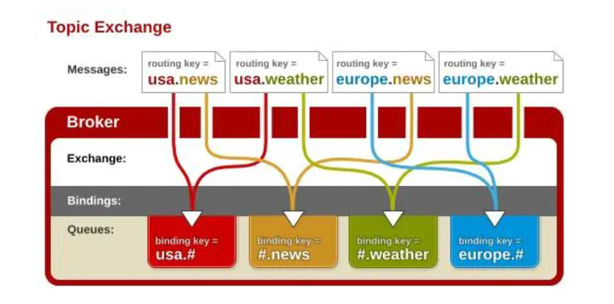 主题交换机会根据这个规则将数据发送到对应的(多个)队列上。