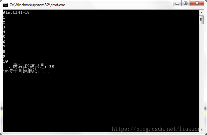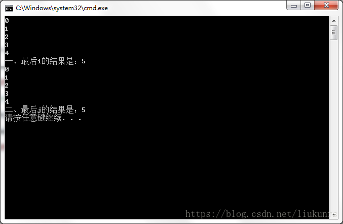 cout << "一、最后i的结果是:" << i << endl;//最后++i导致i=10的时候,通过i<j?的比较发现不符合要求,就会跳出循环,但是i已经等于10了