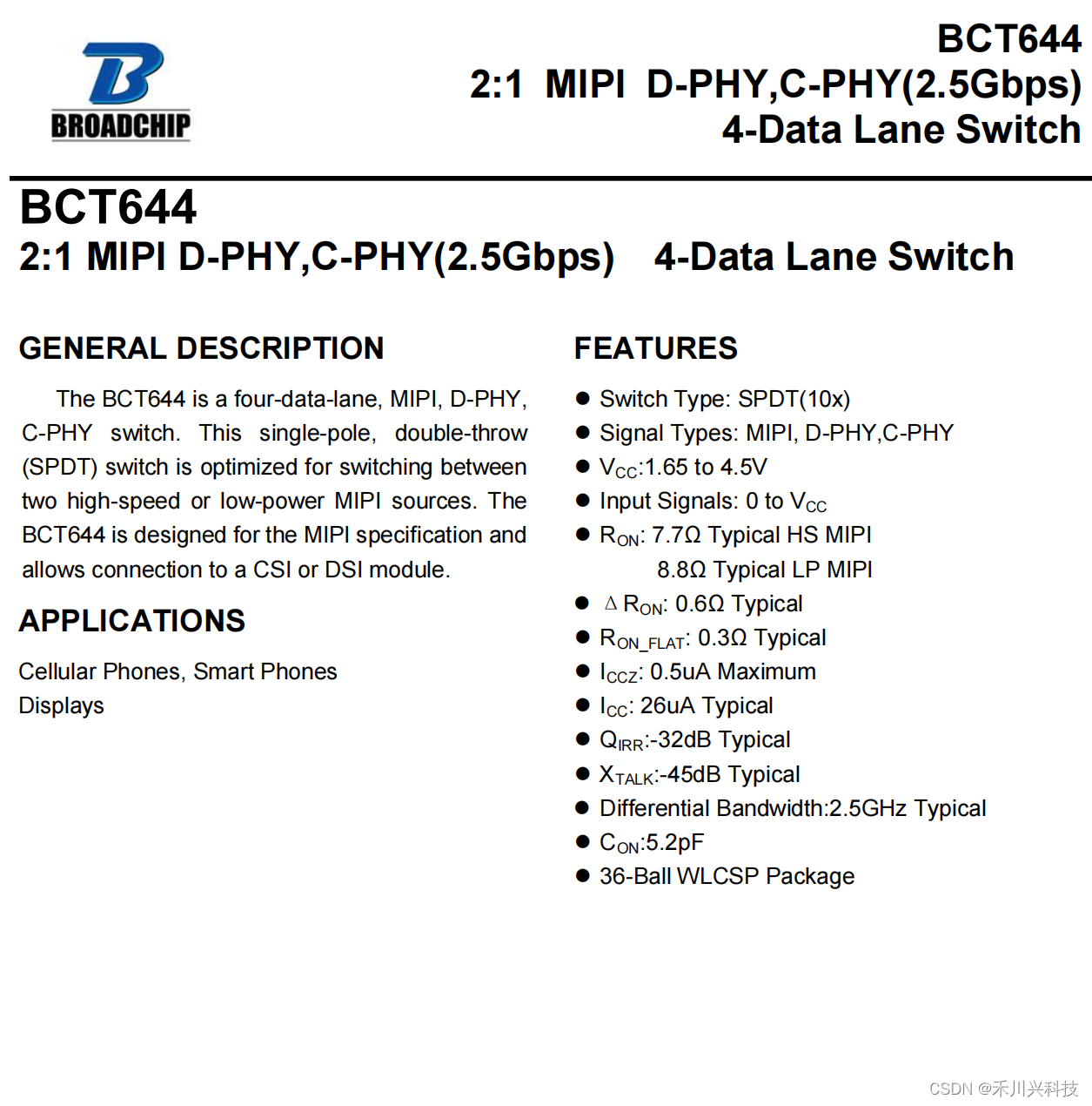 BCT 644适用于MIPI规范和RON:7.7Ω典型的HS-MIP