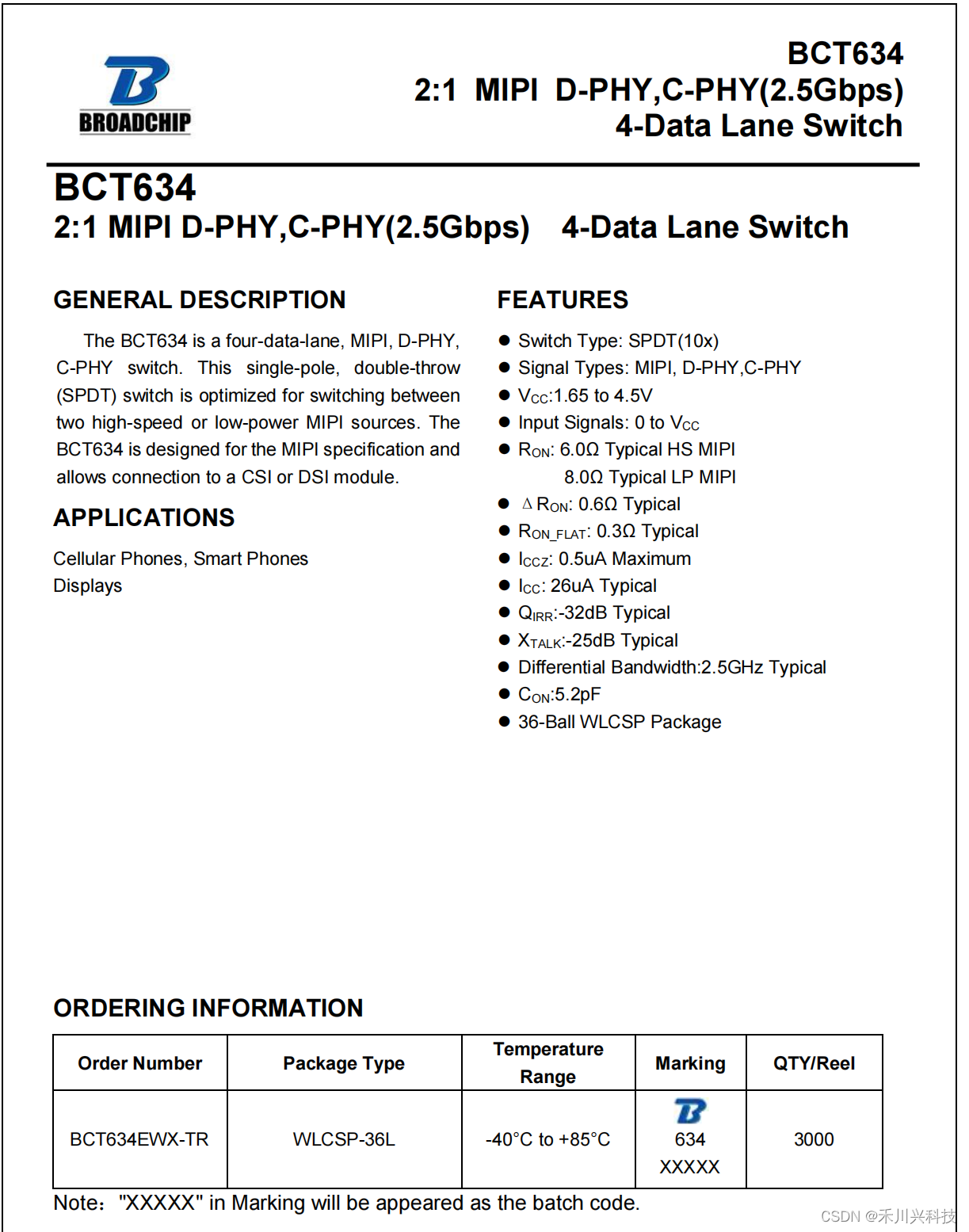 BCT 634 是一款four-data-lane,MIPI,D-PHY●Switch Type:SPDT(10x)