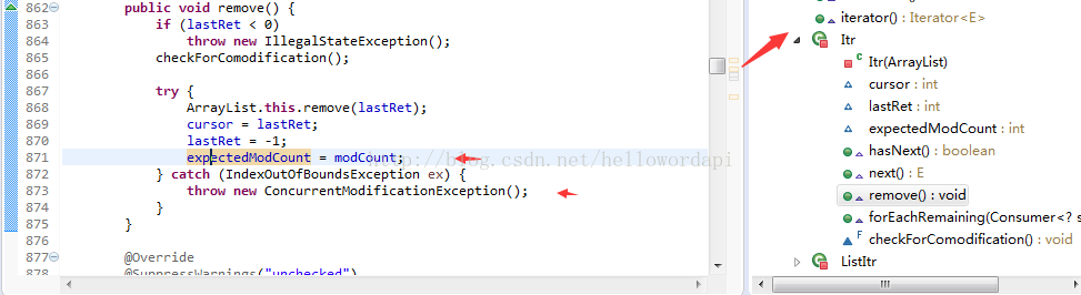 modCount是当前集合的版本号,每次修改(增、删)集合都会加1;expectedModCount是当前迭代器的版本号,在迭代器实例化时初始化为modCount。我们看到在checkForComodification()方法中就是在验证modCount的值和expectedModCount的值是否相等,所以当你在调用了ArrayList.add()或者ArrayList.remove()时,只更新了modCount的状态,而迭代器中的expectedModCount未同步,因此才会抛出异常。