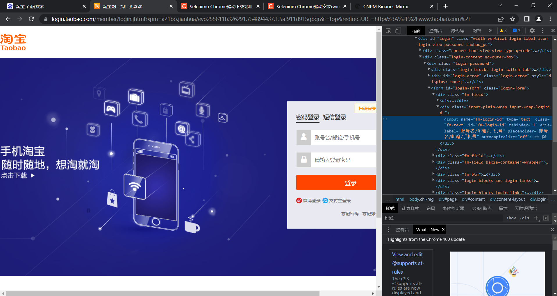 打开某宝官网,点击登录,按f12查看网页源码,定位到账号输入框、密码输入框和登录按钮复制它们的xpath 。
