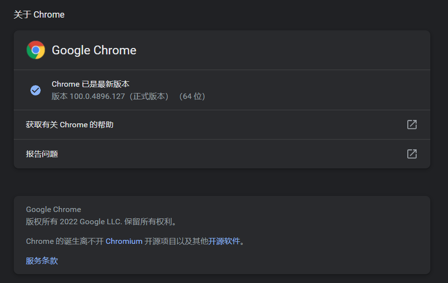 我们会看到自己的浏览器版本,可以看到我的浏览器版本为100.0.4896.127(正式版本)