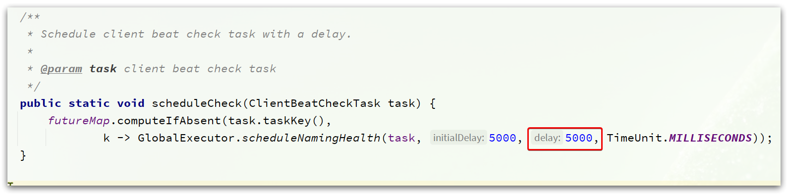 可以看到,该任务是5000ms执行一次,也就是5秒对实例的心跳状态做一次检测。