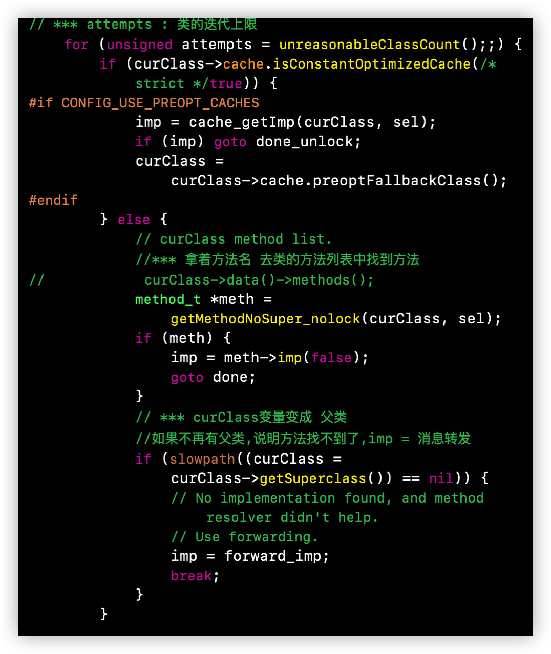 如果没有找到,就会执行 __objc_msgSend_uncached 方法,从而转到C语言中的lookUpImpOrForward