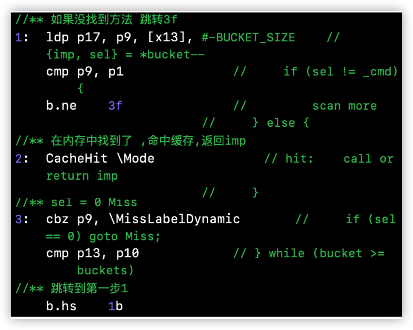 - 在汇编语言中, _objc_msgSend 是入口,方法会由 CacheLookup 方法去cache缓存中查找