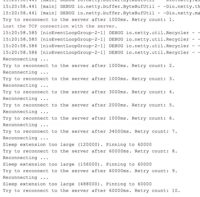 可以看到,当客户端发现无法连接到服务器端,所以一直尝试重连。随着重试次数增加,重试时间间隔越大,但又不想无限增大下去,所以需要定一个阈值,比如60s。如上图所示,当下一次重试时间超过60s时,会打印Sleep extension too large(*). Pinning to 60000,单位为ms。出现这句话的意思是,计算出来的时间超过阈值(60s),所以把真正睡眠的时间重置为阈值(60s)。