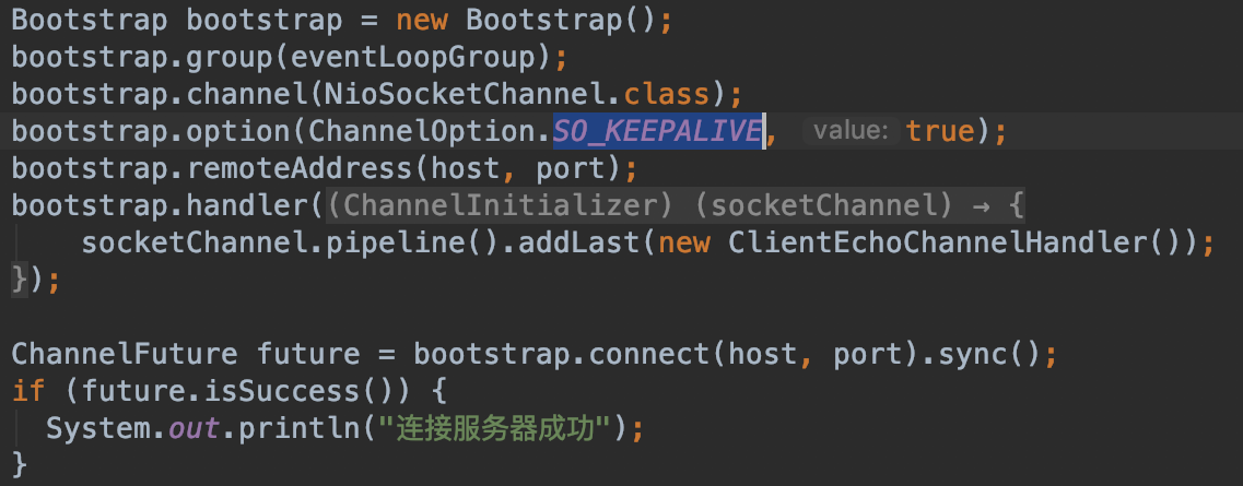 基于TCP的keepalive机制,由具体的TCP协议栈来实现长连接的维持。如在netty中可以在创建channel的时候,指定SO_KEEPALIVE参数来实现:
