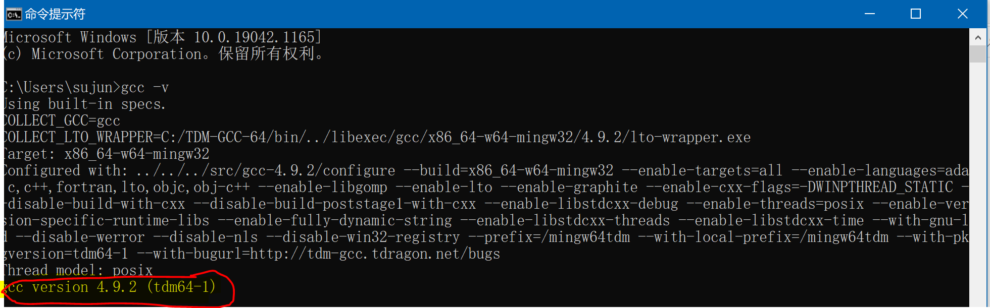 安装完成后可以确认一下是否安装成功,直接在CMD中输入“gcc -v”,如果出来提示版本为4.9.2就表明已经成功安装4.9.2版本的TDM-GCC-64。