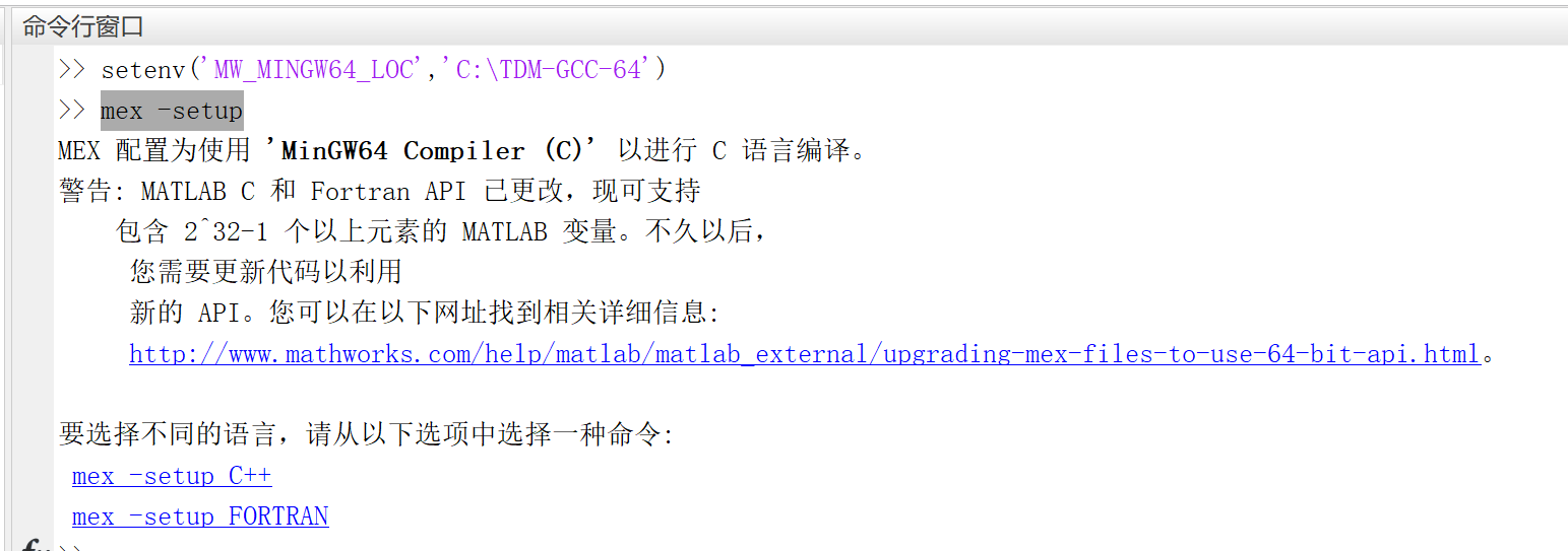 1)、直接在Matlab的命令行中输入:setenv('MW_MINGW64_LOC','C:TDM-GCC-64')