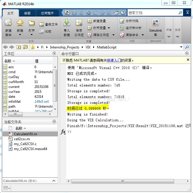 我在计算VIX的时候,使用的是 TS 的分钟线,我的基本思路是把数据保存到本地,然后用C#计算出数据,生成mat文件,供以后使用。
