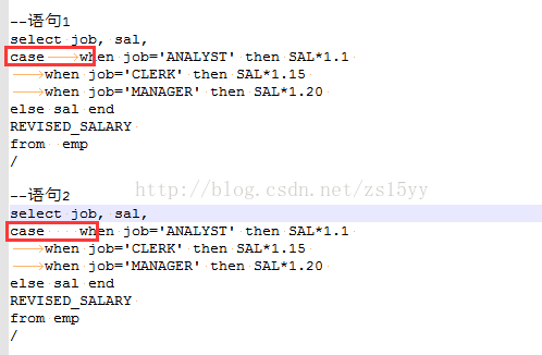 用编辑器打开才发现语句1case后是tab键,语句2case后是空格键,tab键导致sql语句在执行时casewhen是连接在一起的,用记事本看了半天。。。。