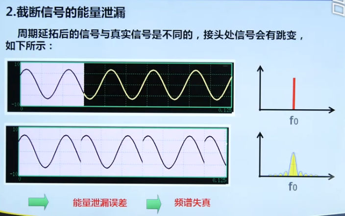 1.信号截断:对信号进行截断,看做以W长度为大小的周期信号进行处理。由于信号截断的原因,产生了能量泄漏,即使信号频率与频谱离散取样点不相等,也能得到该频率分量的一个近似值。
