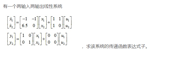 %列写状态空间表达式矩阵 A=[-1 -1;6.5 0]; B=[1 1; 1 0]; C=[1 0; 0 1]; D=[0 0;0 0]; %得到传递函数表达式 [num, den]=ss2tf(A, B, C, D, 2); %在命令行打印传递函数 printsys (num, den);