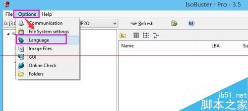 8、现在,我们就可以看到IsoBuster的主界面了,点击“options”(选项)中的“language”;