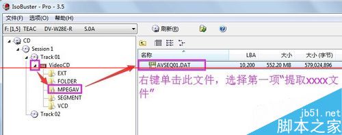 10、现在,我们已经看到光盘内的文件了,一般视频文件会存放在“MPEGAV”这样一个文件夹中,如果没有这样一个文件夹,视频文件也很容易找到,一个个文件夹打开看看,一般都是扩展名为dat或其他视频格式的问件,而且这个文件一般都是最大的文件,从文件大小可以确认。找到后右键点击文件,选择“抽取xxxx文件”命令;