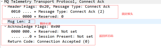 剩余长度字段表示可变报头的长度。 对于 CONNACK 报文这个值等于 2。