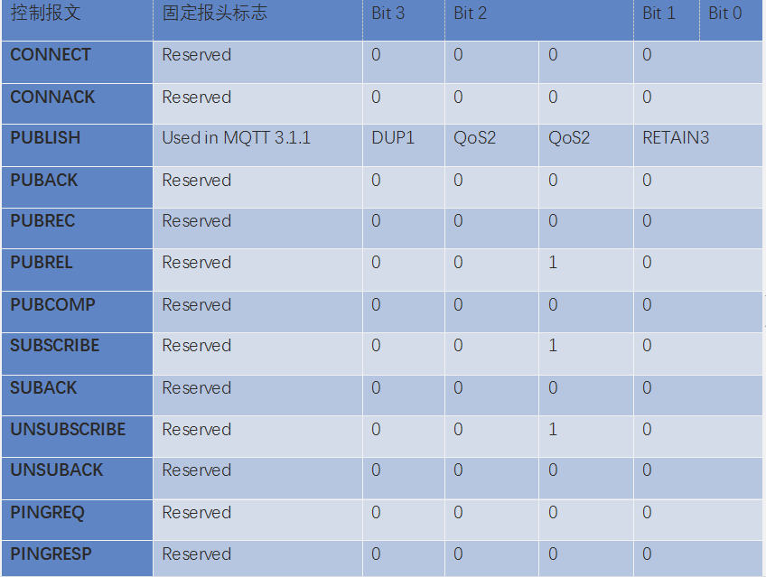 很多控制报文的可变报头部分包含一个两字节的报文标识符字段。 这些报文是 PUBLISH( QoS>0 时) ,PUBACK, PUBREC, PUBREL, PUBCOMP, SUBSCRIBE, SUBACK, UNSUBSCIBE,UNSUBACK,如下表所示: