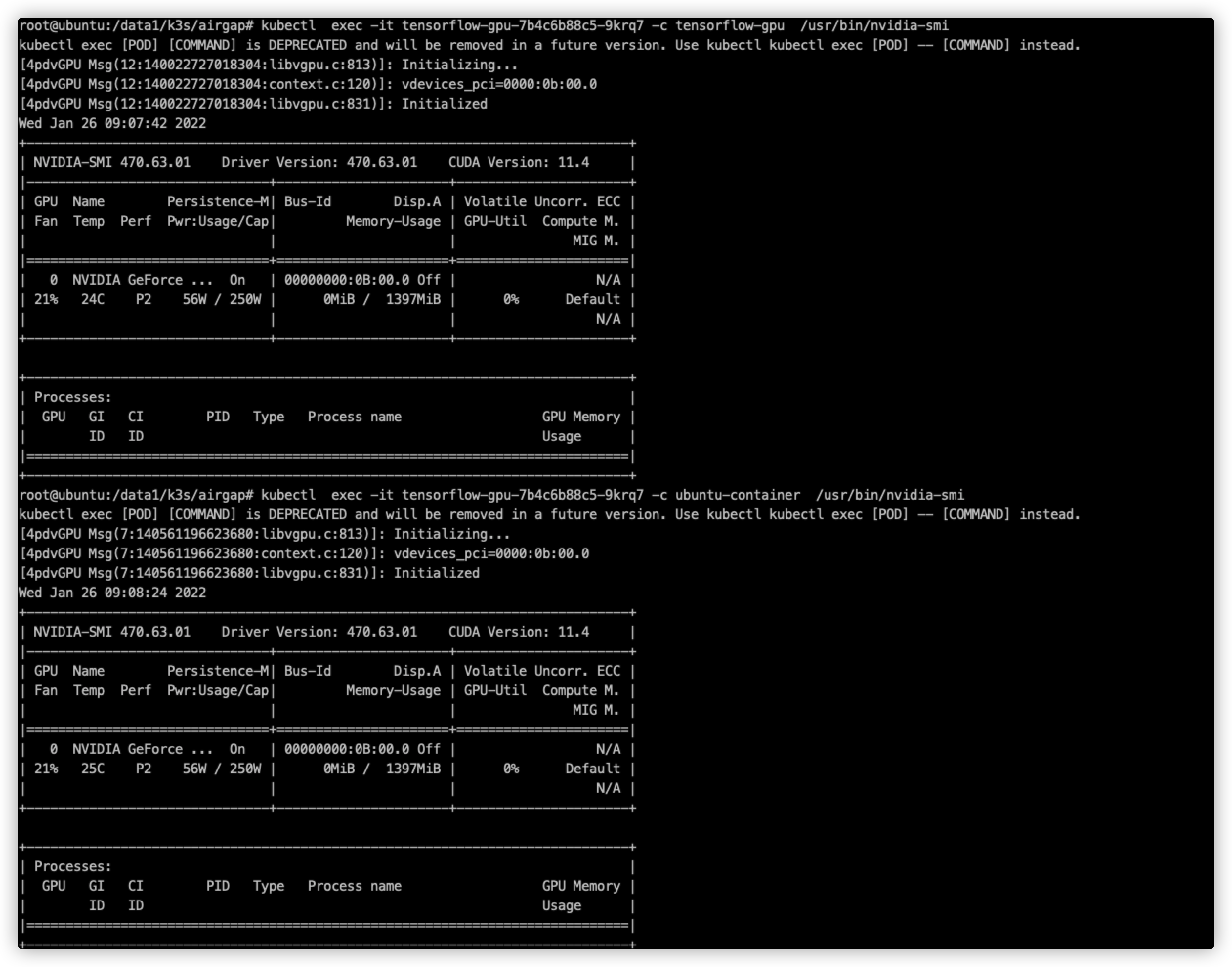 注意: 如果你使用插件装置时,如果没有请求vGPU资源,那容器所在机器的所有vGPU都将暴露给容器。