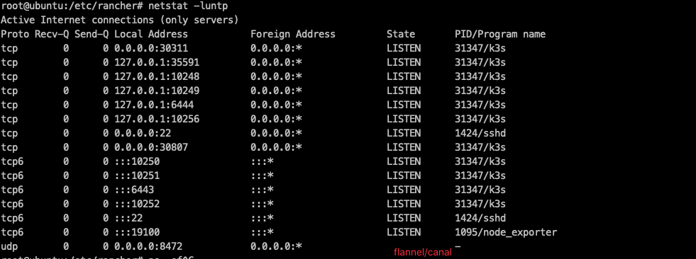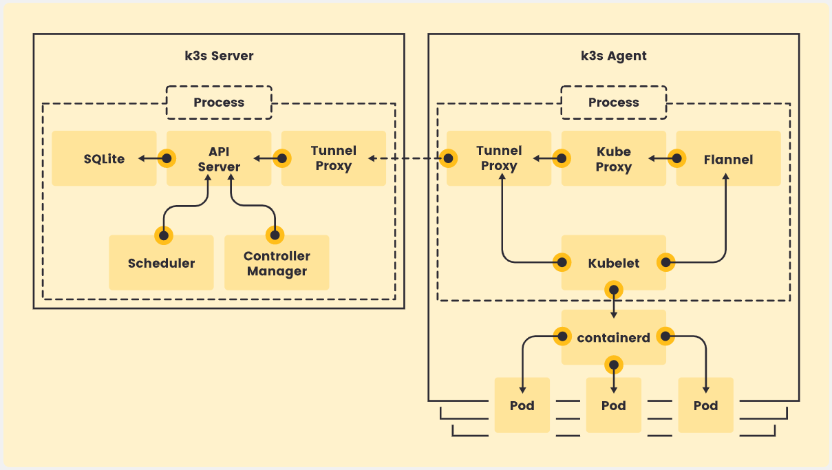 - 将在工作节点上运行的kubelet、kubeproxy和flannel代理进程组合成一个进程。默认情况下,k3s 将以 flannel 作为 CNI 运行,使用 VXLAN 作为默认后端。