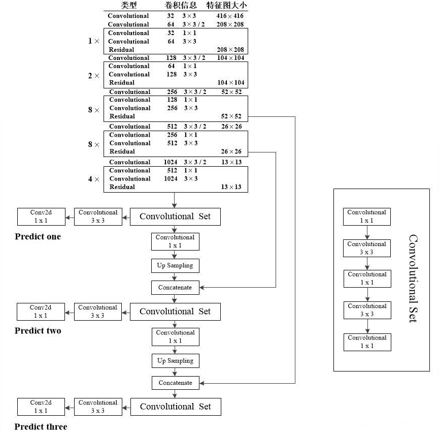 darknet53输出3个不同尺度的检测图,用于检测不同大小的物体。调用3次make_last_layers,产生3个检测图,即y1、y2和y3,如下图所示(图中,y1、y2和y3分别叫Predict one、Predict two和Predict three):