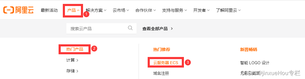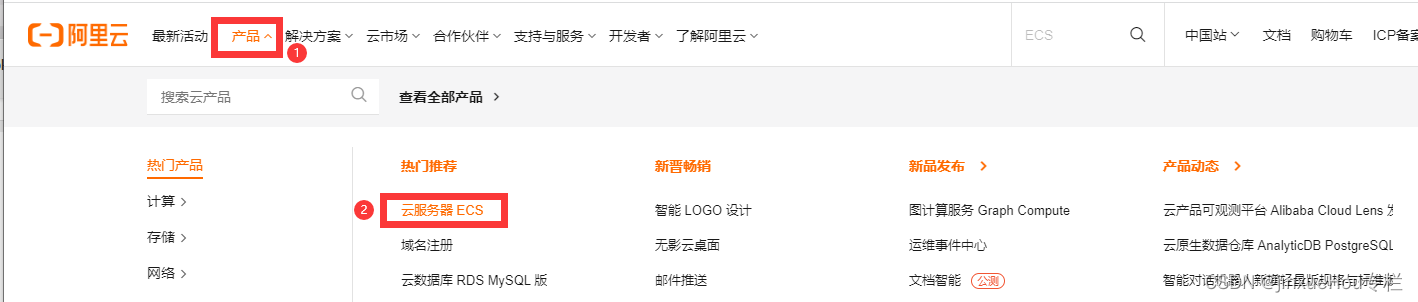 点击“产品”-->“云服务器ECS”,如下所示,